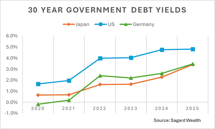 Over the last 5 years the bond market has been sending a strong signal to policymakers and investors. As developed nations continue to run with fiscal deficits (spending more than they earn), they have needed to increase their debt loads (issuing more bonds). However, the market demand for these bonds has been decreasing, therefore increasing the borrowing costs for governments. As the chart below shows, the market has been demanding a higher yield for owning the sovereign debt of the U.S., Germany, and Japan.