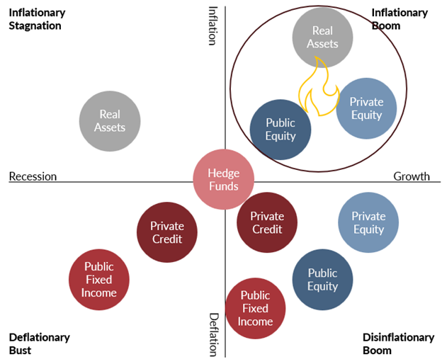 Has our view changed? We still see the same factors driving both corporate and government spending and therefore still support our view that we remain in an inflationary boom. There are now more elevated risks that a prolonged shift higher in energy prices does cause economic contraction, therefore shifting us to the left on the diagram into the inflationary stagnation quadrant. If this shift happens, then owning real assets is a common thread and we still think a larger allocation to that solution protects portfolios from this shift.